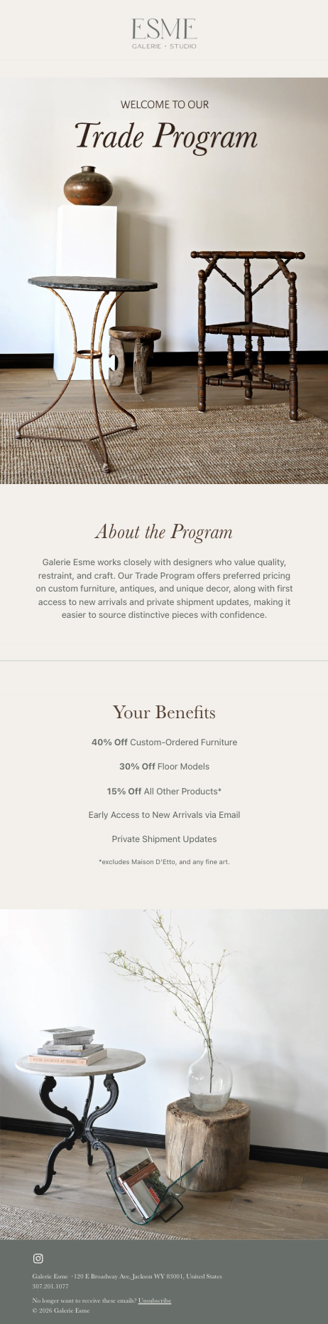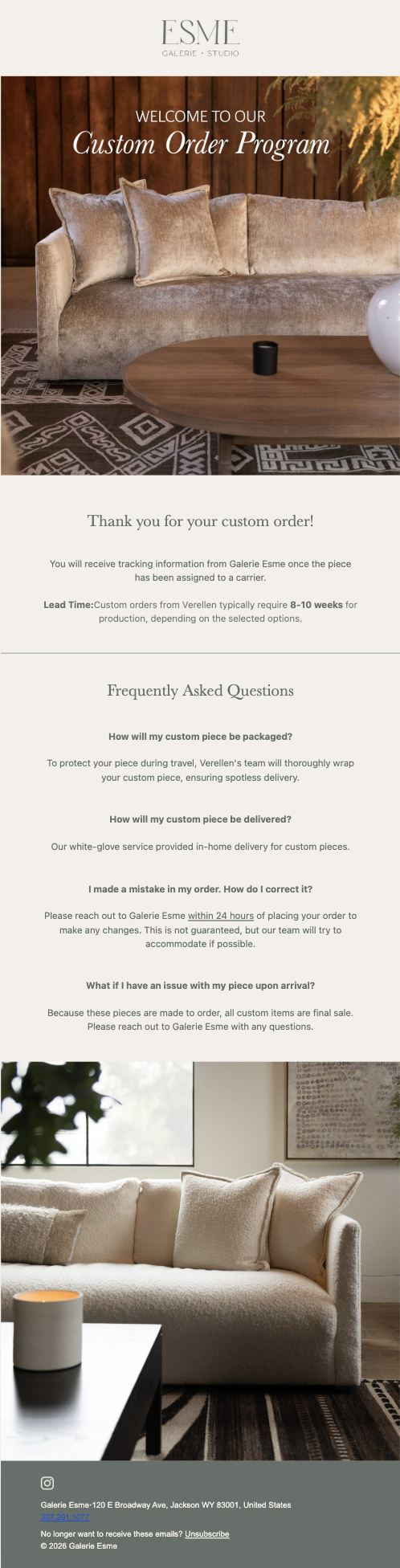 Esme’s comprehensive automated email marketing system supports both retail and design arms of the business, from cart reminders to new arrivals and order updates, as well as interior design trade program and custom order communications.